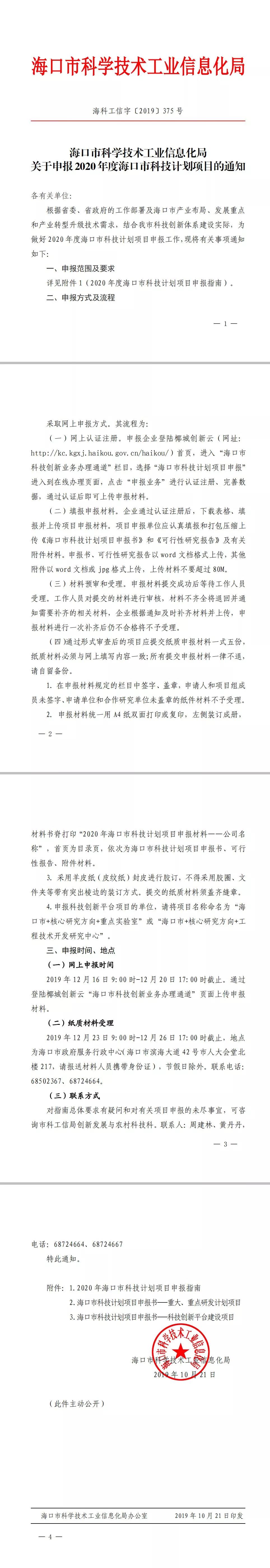 海口市科学技术工业信息化局关于申报2020年度海口市科技计划项目的通知